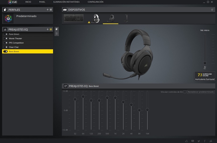 A través del software iCue de Corsair podemos acceder a diferentes opciones de configuración. Tenemos varios perfiles de ecualizadores prediseñados, pero podemos modificarlos libremente y crear otros nuevos. También podemos desactivar o activar el sonido 7.1, el micrófono y ajustar el volumen del mismo.