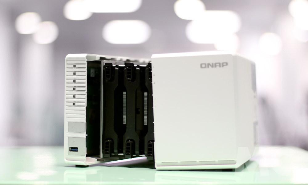 En este sentido QNAP se mantiene fiel a lo visto en iteraciones anteriores (sobresalientes, por otra parte) y apuesta por un amplio chasis en color blanco. La placa está alojada en la zona inferior, mientras que la parte superior se reserva para una sistema de tres bahías refrigerado por un ventilador de 90 mm.