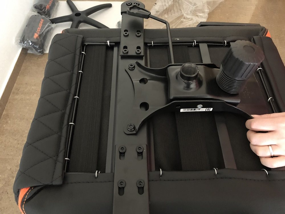 - Una vez terminado colocamos la silla boca abajo y procedemos a colocar la pieza que trae la manivela de regulación de altura. Es un paso muy sencillo, ya que solo tenemos que colocar los cuatro tornillos y listo.