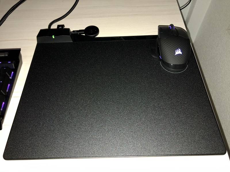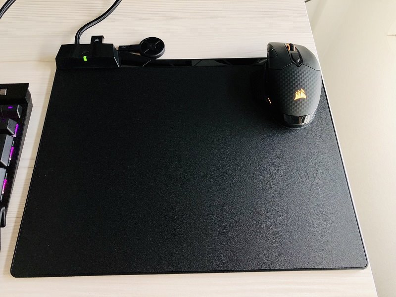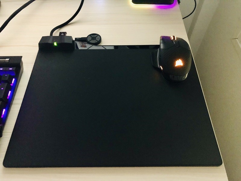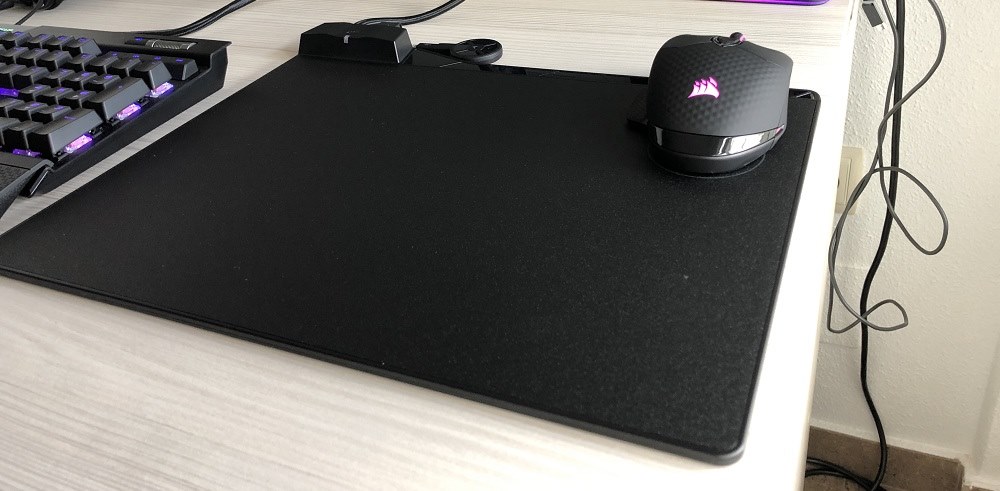 La alfombrilla Corsair MM1000 es como dijimos un complemento excelente de dicho ratón. No es imprescindible, pero sí altamente recomendable, ya que su alta calidad de construcción y su superficie texturizada dura nos ayuda a lograr un deslizamiento perfecto y a simplificar los mantenimientos (limpiezas). La recarga inalámbrica Qi representa un valor añadido que se deja notar a diario, ya que nos permite recargar el ratón cómodamente.