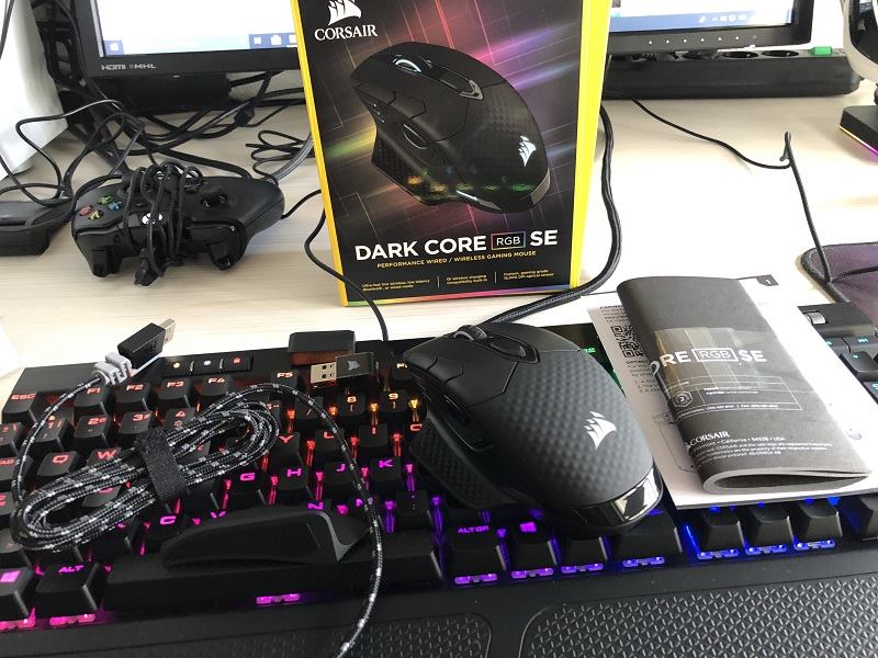 Empezamos con el Corsair Dark Core RGB. Estamos ante un ratón que podemos utilizar tanto de forma cableada como inalámbrica, y que además funciona tanto en la banda de 2,4 GHz como mediante conexión Bluetooth, lo que lo convierte en un modelo muy versátil.