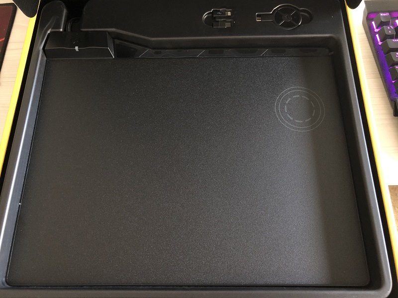 Su superficie no solo permite un deslizamiento perfecto del Dark Core RGB SE, sino que además es muy fácil de limpiar, algo que sin duda se agradece, sobre todo cuando llega la temporada veraniega. En la parte de la derecha cuenta con tres círculos concéntricos que indican la ubicación de la zona de recarga inalámbrica Qi. Basta con poner un dispositivo compatible con dicha tecnología sobre esa zona para que empiece el proceso de recarga de la batería.