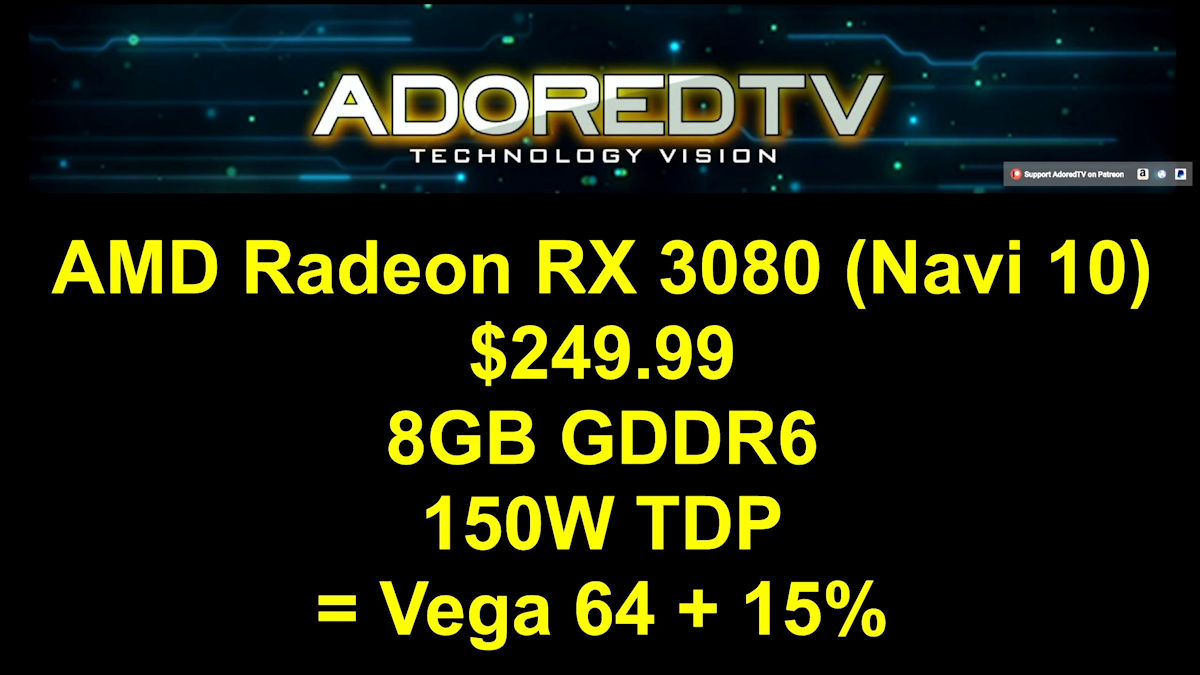• Radeon RX 3080: basada en Navi 10, equipada con 8 GB de GDDR6 y con un TDP de 150 vatios. Su rendimiento sería un 15% mayor que el de una RX Vega 64, costaría 249,99 dólares.