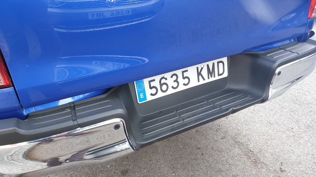 En un coche con esta altura no pueden faltar unas estriberas laterales de metal con recubrimiento en plástico en las zonas de acceso al interior del coche para facilitar la subida de los pasajeros. En la parte trasera la caja de carga viene rematada por dos grupos ópticos también muy grandes y protegidas por un gran paragolpes en color metálico interrumpido en el centro por otra estribera de plástico que facilita el que podamos acceder al contenido de la caja y que se aprovecha para colocar la matrícula.