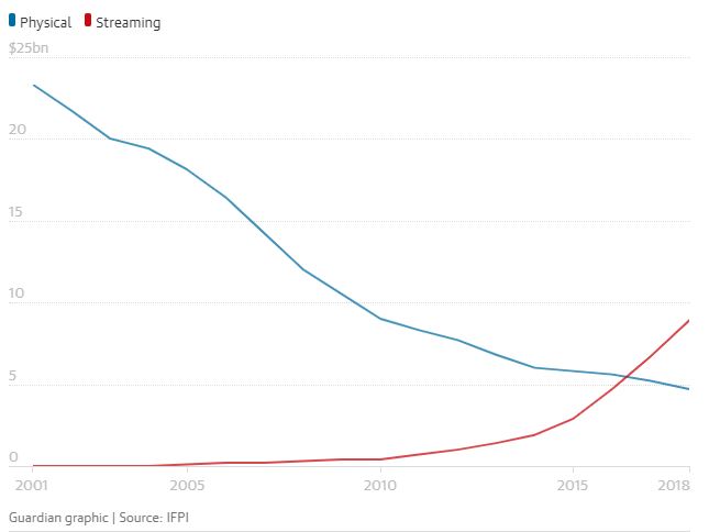 Mucho han cambiado las cosas desde entonces. Servicios como Spotify, Apple Music o Amazon Music crecen a un 34% interanual y ya suponen unos 8.900 millones de dólares al año, aproximadamente el 47% del total. La venta de formatos físicos (principalmente CD, pero también vinilos) cae un 10% y se queda en 4.700 millones, según cifras de la Federación Internacional de la Industria Fonográfica que recoge The Guardian.