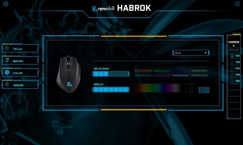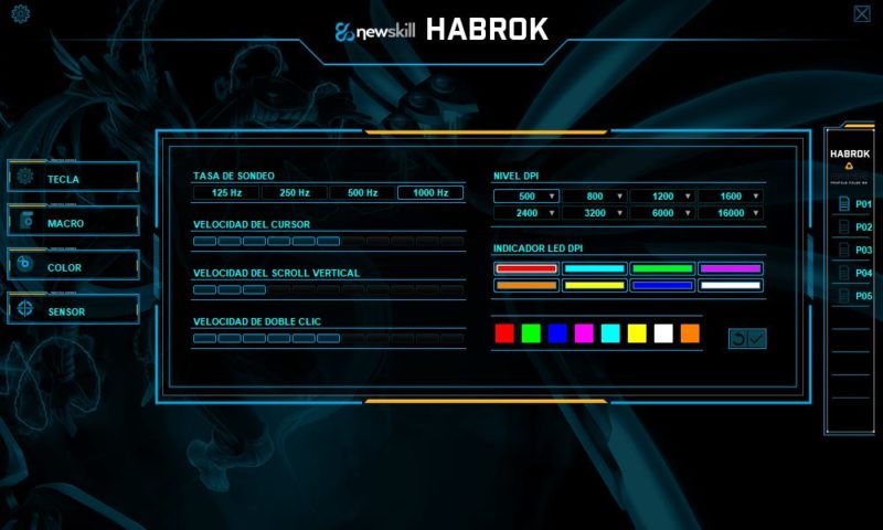 Sin embargo, sí que contaremos con bastantes opciones a la hora de personalizar estos colores, a través de un software propio que podremos descargar a través de la web oficial de Newskill (o este enlace directo), desde el cual, mediante una navegación bastante sencilla a través de cuatro pestañas, podremos configurar las distintas funciones de los ocho botones del ratón, ajustar la sensibilidad del sensor óptico, e incluso crear y asignar nuestras propias macros.