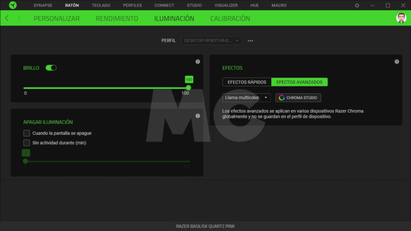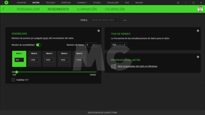 Así pues podremos configurar los 9 botones del ratón para asignarles diferentes funciones, e incluso crear y gestionar macros, eso sí, siempre y cuando hayamos creado una cuenta Razer. Haciendo un repaso rápido, encontramos con cuatro pestañas que se dividirán en la asignación y personalización de las funciones de los botones y el editor de macros; el rendimiento y configuración del sensor óptico; las opciones y personalización del sistema de iluminación RGB; y la calibración de superficies de uso o alfombrillas.