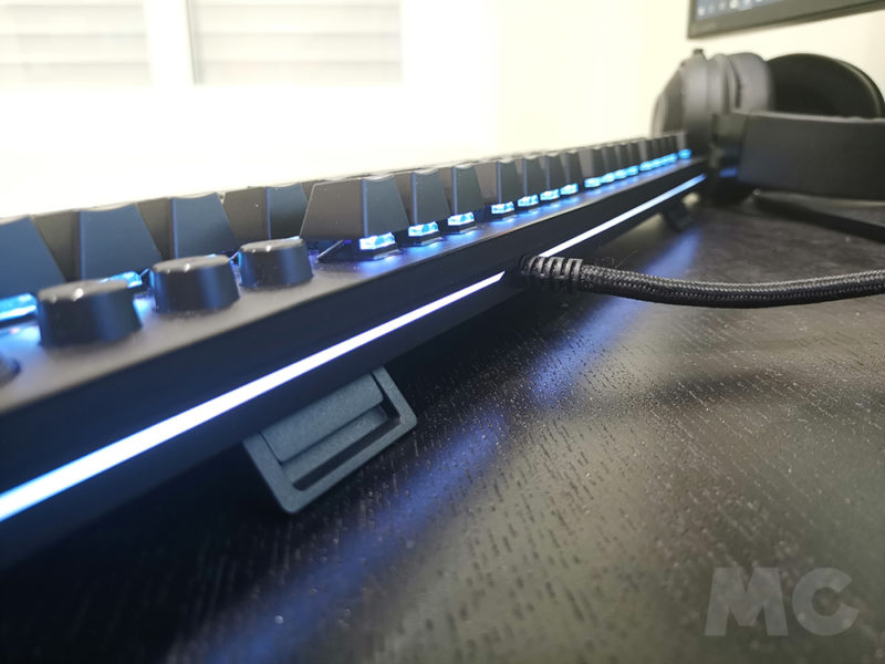 Pasando a la parte trasera del teclado, destaca la generosa cantidad de superficies de goma antideslizante, con hasta cinco bandas de distintos tamaños que harán casi imposible que el teclado se desplace de forma involuntaria durante su uso. Además, contaremos también con unas patas elevadoras con dos niveles de altura, y que también estarán equipados con el mismo material antideslizante.