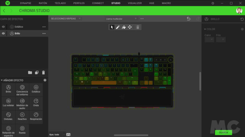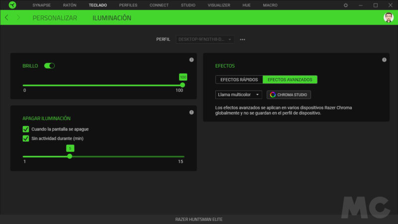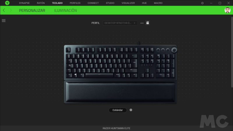 Igual que la gran mayoría de productos de la marca, el Huntsman Elite requerirá del software Razer Synapse para poder acceder a la configuración completa del teclado. Así pues, y resumiendo de forma rápida las opciones, nos encontraremos con sólo dos pestañas: la primera destinada a la asignación de las funciones de las teclas y la edición de macros o perfiles de usuario (los cuales podremos además almacenar en la memoria interna del propio teclado para cuando lo transportemos); y una segunda mediante la cual podremos acceder a Chroma Studio, desde donde controlaremos las diferentes opciones de iluminación.