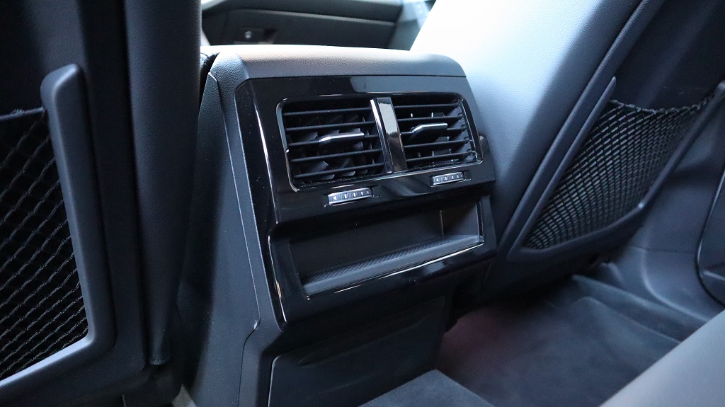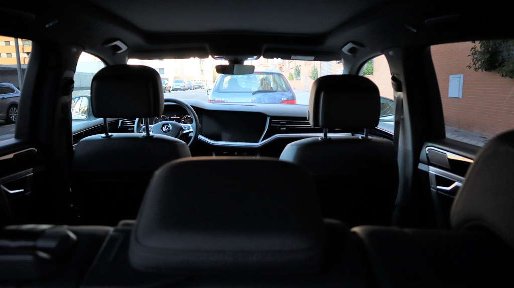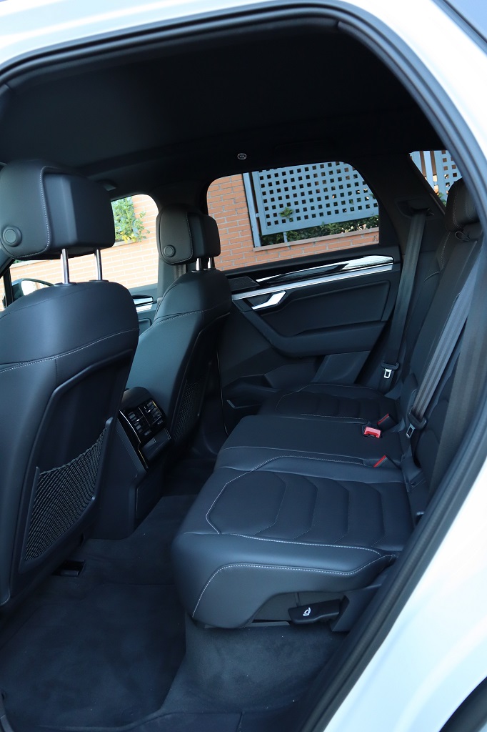 Aunque hay espacio de sobra en la parte delantera, donde más se nota la generosidad de las dimensiones del Touareg es en los asientos traseros. La anchura es holgada y más que suficiente para tres personas. El túnel de transmisión provoca un relieve en el centro pero no es muy alto y apenas molesta para la colocación de las piernas del pasajero del centro. El espacio para las piernas también es sobresaliente y además es configurable ya que podemos desplazar los asientos longitudinalmente e incluso variar la inclinación del respaldo. Dispone de aireación independiente de las plazas traseras y una buena cantidad de huecos portaobjetos.