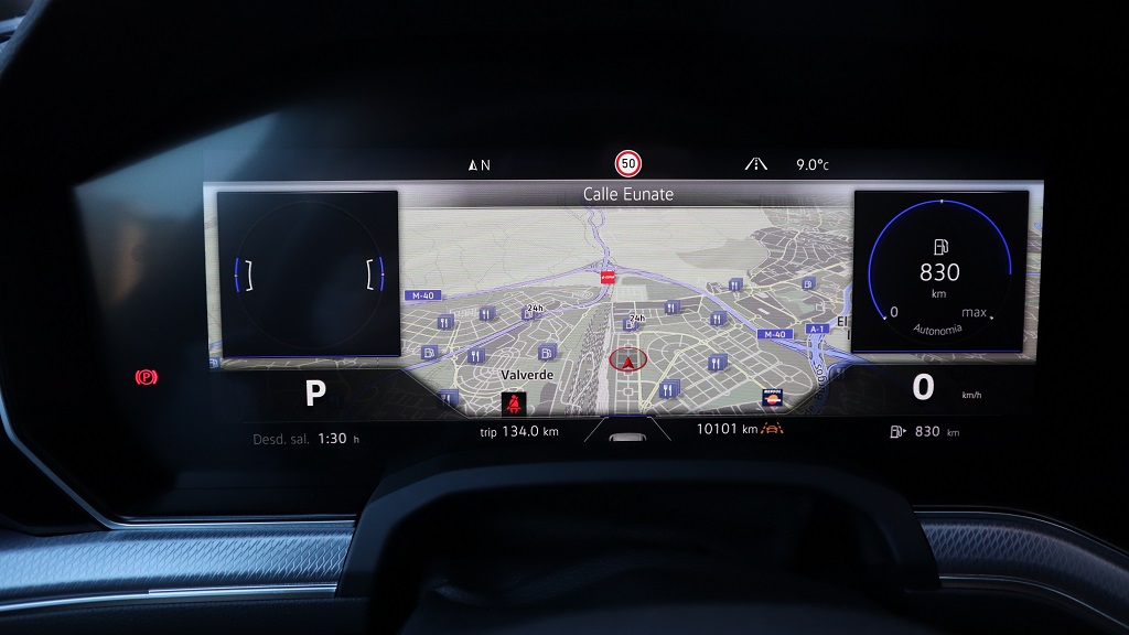La pantalla de información tras el volante es parecida a la que encontramos en otros modelos de Volkswagen y ofrece varias posibilidades de configuración como la de mostrar el mapa del navegador o la información del radar del control de crucero. La pantalla de 15 pulgadas es de muy buena calidad y la respuesta táctil es muy buena, aunque el que no haya botones físicos limita el que podamos encontrarlos con el tacto por lo que desplazaremos la vista a la pantalla. Por otro lado la ausencia de botones le da un aspecto increíble al interior, sobre todo con las pantallas apagadas lo que vemos es una gran superficie de cristal de color negro. Un efecto «nave espacial» en reposo realmente conseguido.