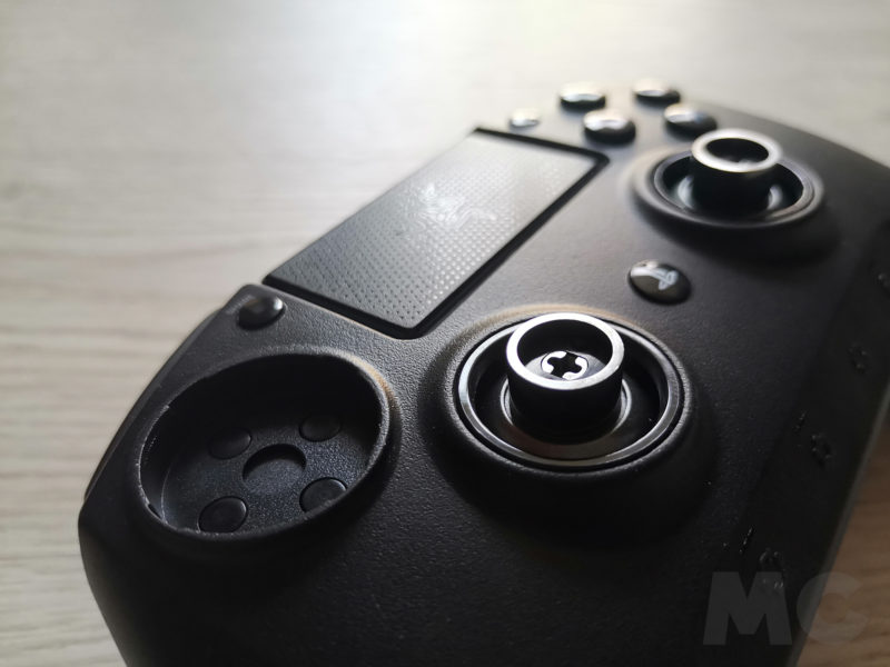 Con un diseño algo tosco y pesado, en esta ocasión vemos cómo el Razer Raiju Ultimate se separa un poco más del original de PS4, recordándonos incluso a los mandos de la Xbox. Manteniendo la disposición de los joysticks en la parte interior del mismo, notamos una ligera separación a más entre ambos analógicos con respecto al Dualshock 4, lo que nos permite mantener una postura más natural y relajada para las manos.