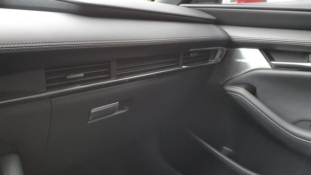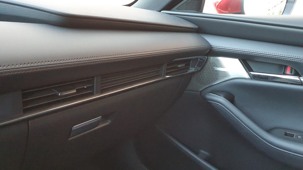El resto de elementos de la parte delantera siguen la filosofía de sencillez de la kilosofía KODO que sirve de inspiración también para la línea de la carrocería. Los acabados de esta versión (Zenith) incluyen además detalles en cuero que resaltan la elegancia del interior. La pantalla de información y entretenimiento es de 7 pulgadas y se encuentra, acertadamente, en la parte superior.