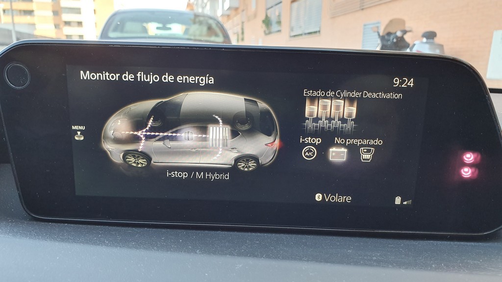 Como decimos el funcionamiento en ciudad es impecable, e incluso sorprendente como por ejemplo el sistema de start & stop, llamado i-stop por Mazda, que es el más rápido en arrancar de los que hemos probado. Simplemente no hay ningún tipo de espera entre que pisamos el embrague para arrancar cuando el motor se ha detenido en un semáforo. Es tan natural e inmediato que parece que estamos montados en un coche híbrido tradicional o eléctrico. Y aquí estimamos también que la ayuda del pequeño motor eléctrico de 24V es parcialmente responsable.