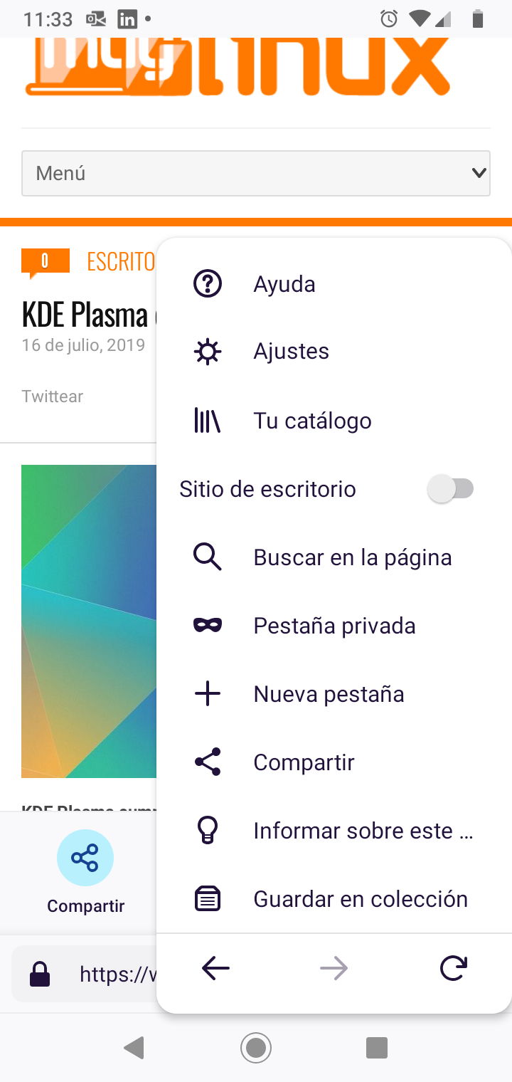 Si el usuario quiere acceder a las opciones de compartir con otras aplicaciones, agregar una página web a marcadores o bien acceder al modo lectura tendrá que levantar (arrastrar hacia arriba) una diminuta barra horizontal que aparece justo encima de la barra de direcciones. Desde la pestaña ejecutada en primer plano se puede acceder a la lista de pestañas abiertas. Por otro lado, el menú de opciones cambia, ofreciéndose desde ahí también la posibilidad de compartir, acceso a los Ajustes y el Catálogo, la apertura de una nueva pestaña estándar o privada, la solicitud de la versión para escritorio y la característica de buscar en la página.