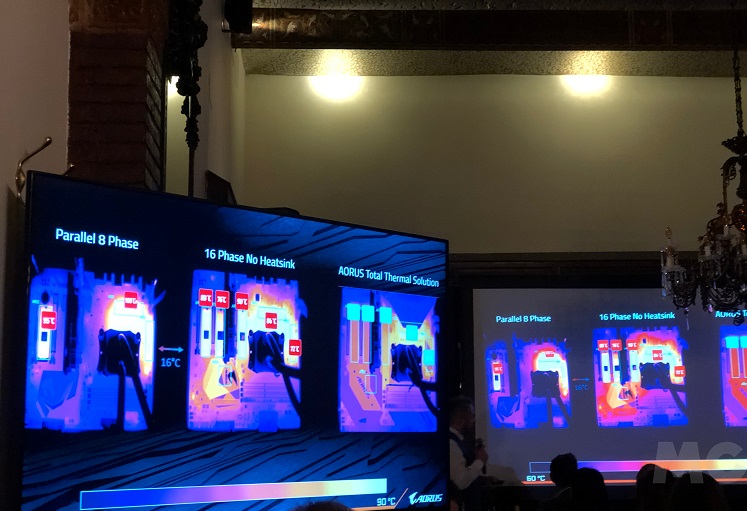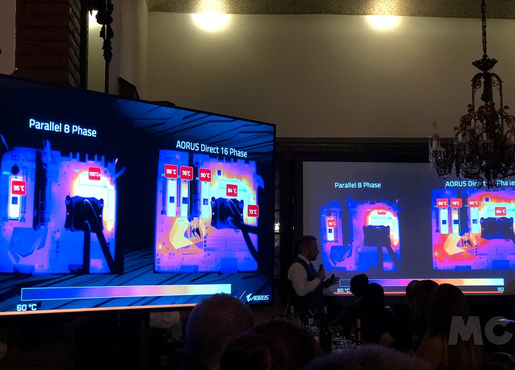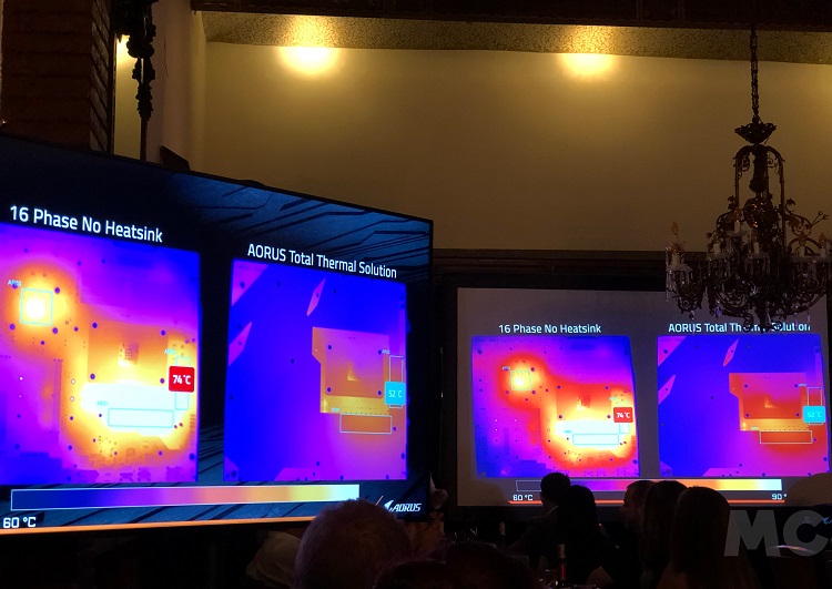 Esto implica, sin embargo, un mayor desafío a la hora de disipar el calor que se acumula, como dijimos, en las partes más importantes de la placa base. La ensambladora taiwanesa ha respondido a este problema con un completo sistema de refrigeración que combina elementos pasivos y activos y que, como vemos en la imagen, logra mantener medias estables de 50 a 60 grados.