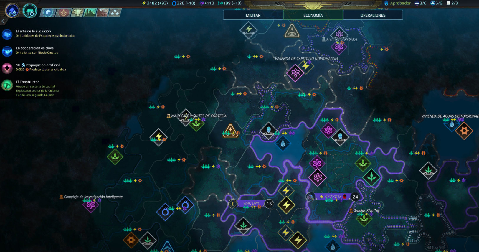 Los hay de tierra y también marítimos, con su propias ventajas. Hay otros sectores con distintos recursos, como tierras fértiles que nos proporcionan alimentos (imprescindibles para conseguir población y expandirnos). También hay otros llenos de viejas ruinas que ofrecen recursos especiales, armas o avances de investigación. Hay mucha variedad y es fácil perderse. El mapa táctico mencionado accesible con el zoom ofrece una visión de las ventajas de cada uno de ellos y su propiedad por cada raza.