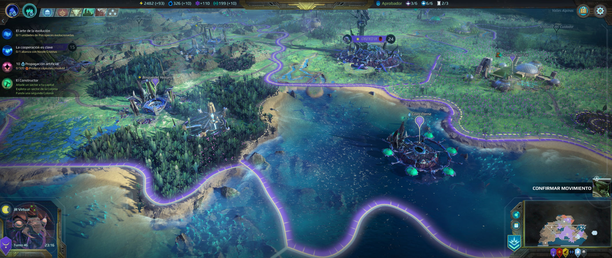 Las facciones no están tan conectadas a ese pasado (en teoría común) como prometiera el desarrollador. Una vez sucumbido el imperio galáctico del que formaban parte y del que parte el juego, cada una ha ido evolucionando por su cuenta. Son muy distintas y cuesta entender lo que nos propone el guionista. Lo mismo que las complejas relaciones entre ellas; lleva tiempo y un ejercicio de meterse en una historia algo desconcertante. Bastante raro el juego en este sentido (pasa con otros) aunque la verdad es que no tiene un gran efecto en lo que verdaderamente importa, una gran jugabilidad de la que sí hace gala el nuevo AoW.