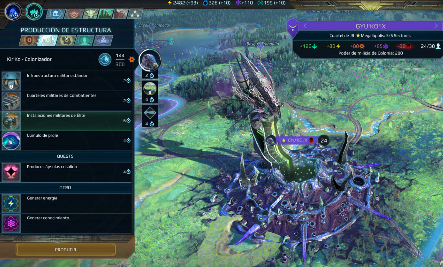 La gestión de la colonia también está bien resuelta y es típica en juegos de estrategia. Se pueden producir estructuras, unidades y mejoras para los sectores anexionados. También se pueden gestionar los siempre importantes colonos y trasladarlos en cualquier momento a la producción de alimentos, energía, producción, ciencia o a la propia felicidad de la colonia.
