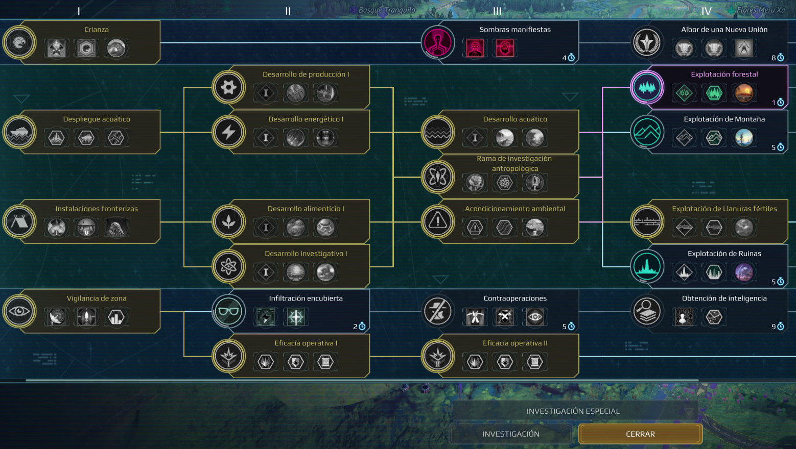 Los árboles de investigación están divididos de 1 a 10 niveles y cada apartado ofrece información precisa de sus ventajas en un menú contextual que aparece situando el ratón encima de ellas. Simplemente asignas lo que más te interese y dependiendo de tu nivel de conocimiento en cada momento. Hay bastantes apartados por investigar, algunos bastante raros en sintonía con las facciones y el propio juego. Muy lineal, bien explicados, pero la mayoría no suponen tanto avance como prometen.