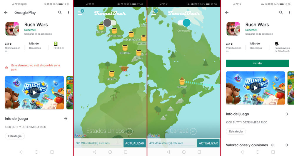 Con la aplicación todavía abierta, volveremos a abrir la Google Play Store, buscaremos «Rush Wars», y podremos descargar e instalar el juego. Por último, y antes de cerrar TunnelBear, deberemos abrir el juego, comenzar una partida, y completar el tutorial.