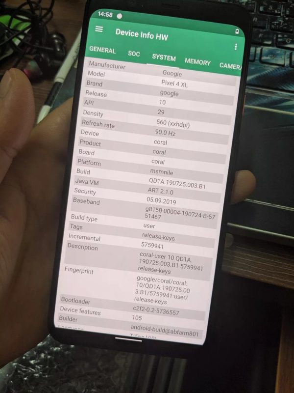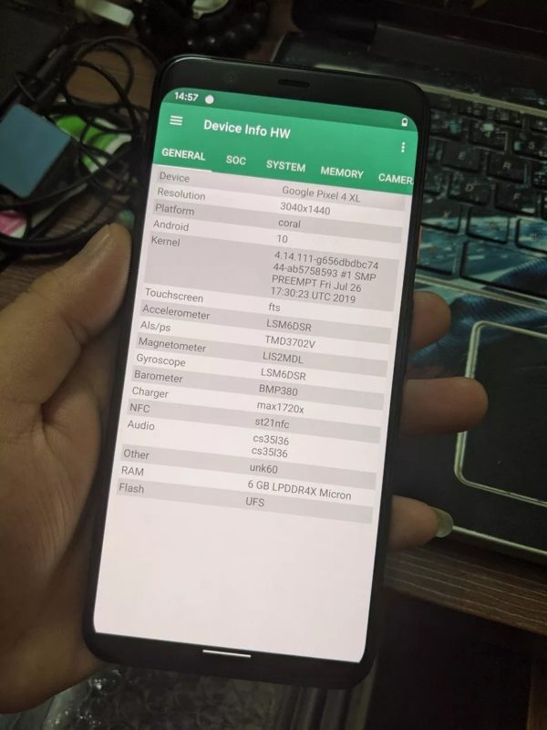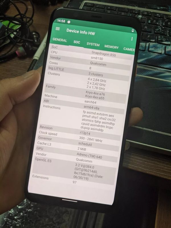 Además, estas capturas también han servido para detallar todas las especificaciones internas del Pixel 4 XL, confirmándose así el procesador Snapdragon 855 de ocho núcleos (4x 2,84 GHz, 2x 2,42 GHz y 2x 1,78 GHz) con unas velocidades de reloj hasta los 2.841 MHz, y acompañado de una GPU Ardeno 640.