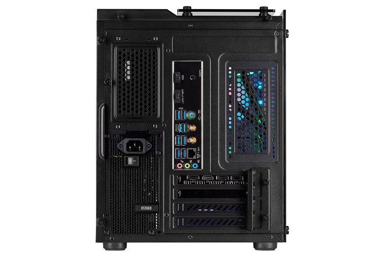 El diseño del chasis es muy atractivo. Tenemos unas líneas angulosas y dos láminas de cristal templado, uno en el frontal y otro en el lateral. Echando un vistazo al interior nos encontramos con un montaje perfecto, limpio de cables y con todos los componentes perfectamente ordenados. Según Corsair este chasis es un 33% más pequeño que una semitorre normal, con todo lo que ello supone a la hora de colocarlo encima del escritorio (ahorramos espacio).