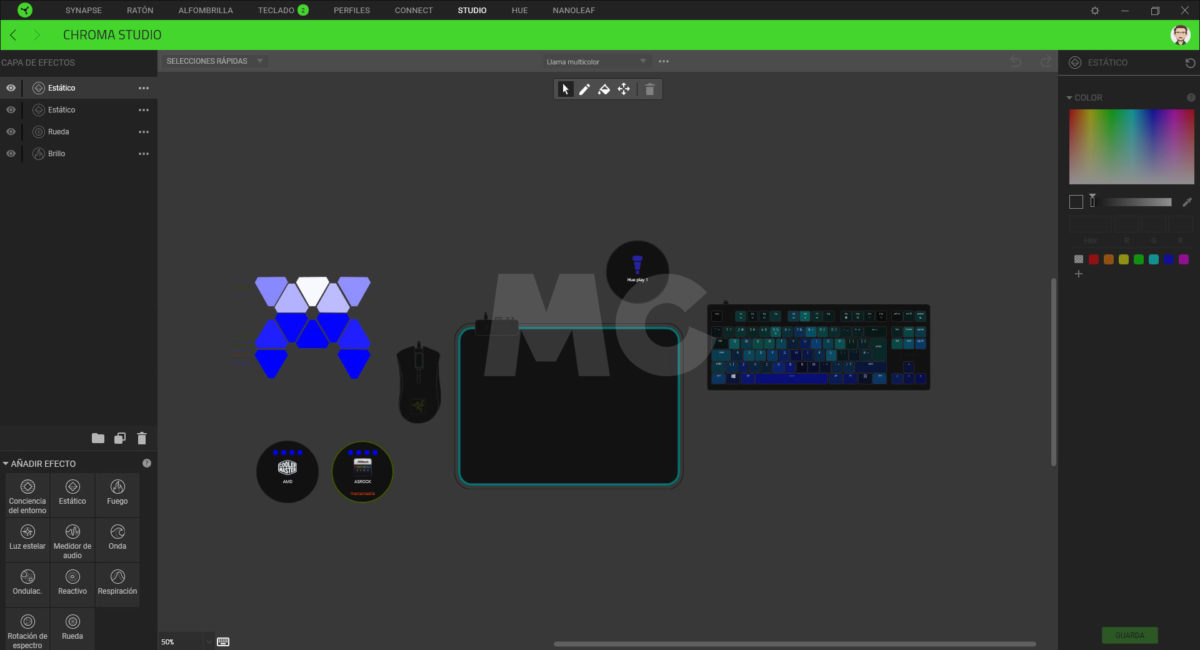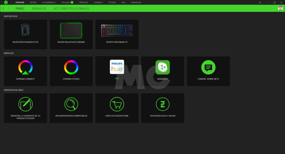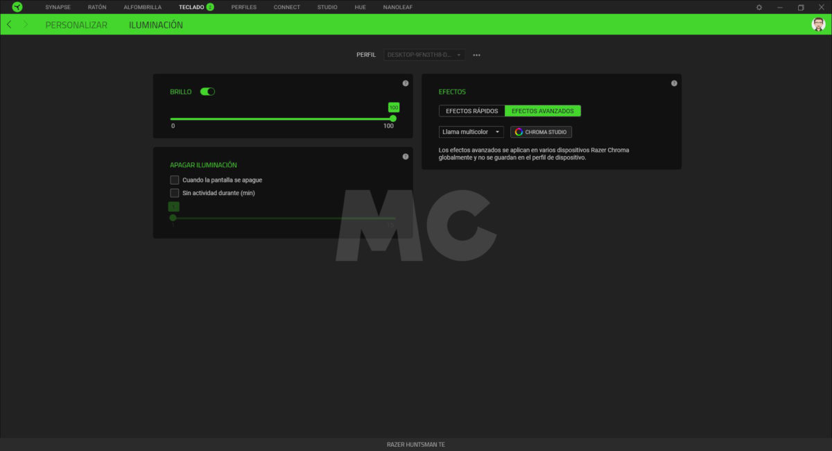 Además de los perfiles que creemos, y siempre que Razer Synapse esté activo, también tendremos acceso a las funciones de iluminación inmersiva para juegos, que nos mostrará de forma automática algunos efectos de iluminación especiales cuando carguemos algunos juegos como Apex Legends, Fortnite, Overwatch, DOOM, Diablo 3, y muchos otros. Unos efectos que se reproducirán no sólo en nuestros periféricos Razer, sino en todos los dispositivos con iluminación disponibles y sincronizados a través de este software, tales como luces, altavoces, ventiladores e incluso nuestra caja.