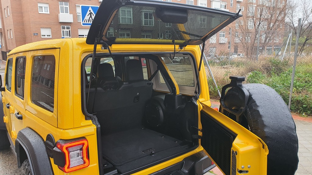 El tipo de apertura del maletero del Wrangler no es la más cómoda en espacios estrechos como aparcamientos de ciudad, sobre todo porque no podemos abrir la luneta cuando la pared del mismo se encuentra cerca de la parte trasera. Hay que tenerlo en cuenta a la hora de operaciones de carga en este tipo de situaciones.