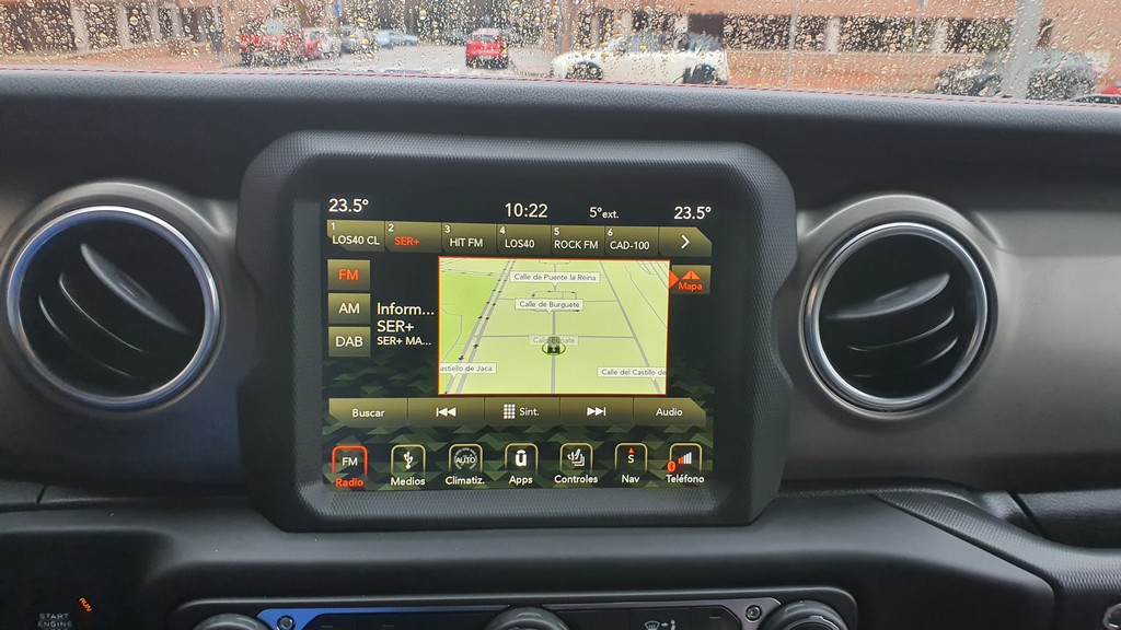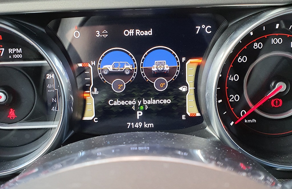 También en lo que respecta a los sistemas de ayuda a la conducción el Wrangler conjuga esa combinación de coche premium y todoterreno sin compromisos. Podemos encontrar desde un buen sistema de cámaras y sensores de aparcamiento (indispensable por el volumen del coche), estado de la batería o indicadores de presión de neumáticos hasta todo tipo de información para su uso todoterreno como ángulos de inclinación, estado del sistema de tracción o temperatura del motor pero también del cambio (muy importante cuando hacemos uso de la reductora).
