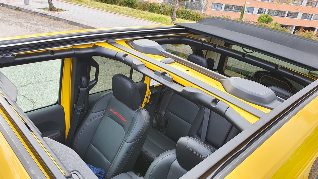 Uno de los elementos que más sorprende de esta versión es el techo de tela que se retira con un mecanismo eléctrico casi por completo convirtiendo al Wrangler en la práctica en un enorme descapotable. El mecanismo funciona perfectamente y el techo queda recogido en la parte posterior. El inconveniente que supone el menor aislamiento acústico por este tipo de techo no es demasiado preocupante en un coche que no tiene en el silencio interior uno de sus objetivos primordiales.