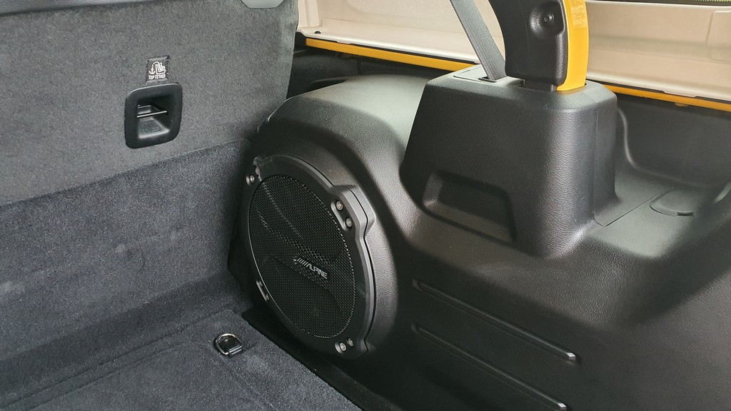 El maletero se abre en dos partes con una portezuela de abertura horizontal que pivota sobre una bisagra en la parte derecha donde se ha fijado la rueda de repuesto y por otro lado una luneta que se abre verticalmente hacia arriba que no se puede utilizar si no se ha abierto la primera. El espacio que queda en el maletero es grande y deja a la vista el enorme subwoofer del potente sistema de sonido Alpine que equipaba la unidad de prueba.