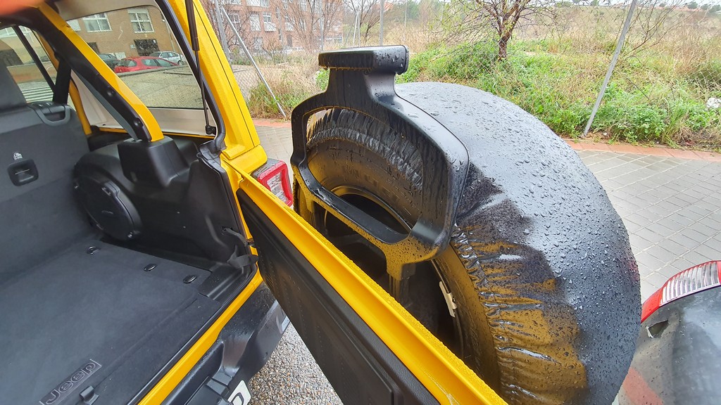 El tipo de apertura del maletero del Wrangler no es la más cómoda en espacios estrechos como aparcamientos de ciudad, sobre todo porque no podemos abrir la luneta cuando la pared del mismo se encuentra cerca de la parte trasera. Hay que tenerlo en cuenta a la hora de operaciones de carga en este tipo de situaciones.