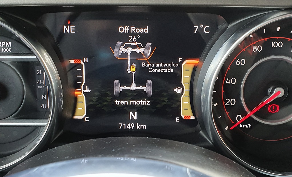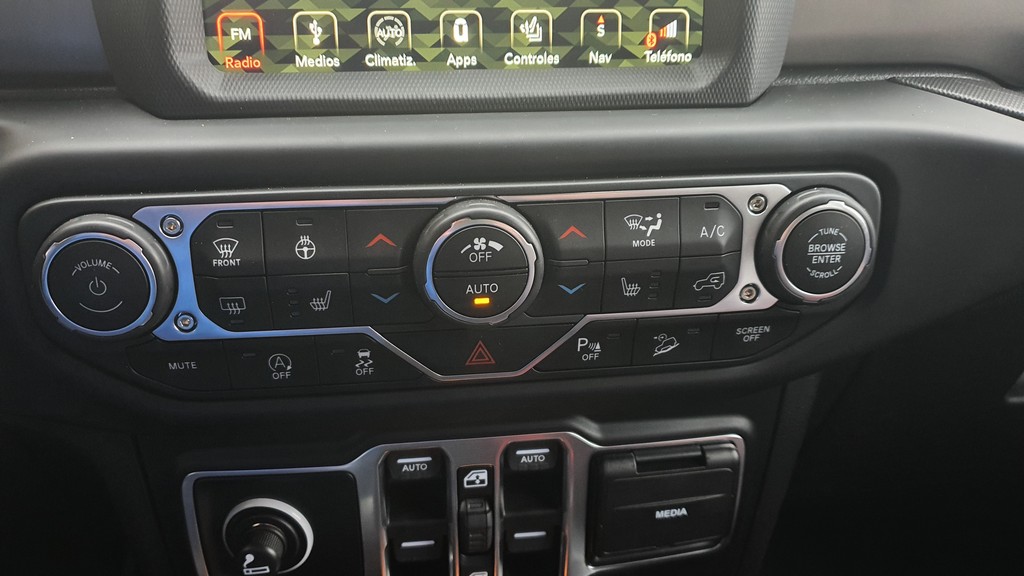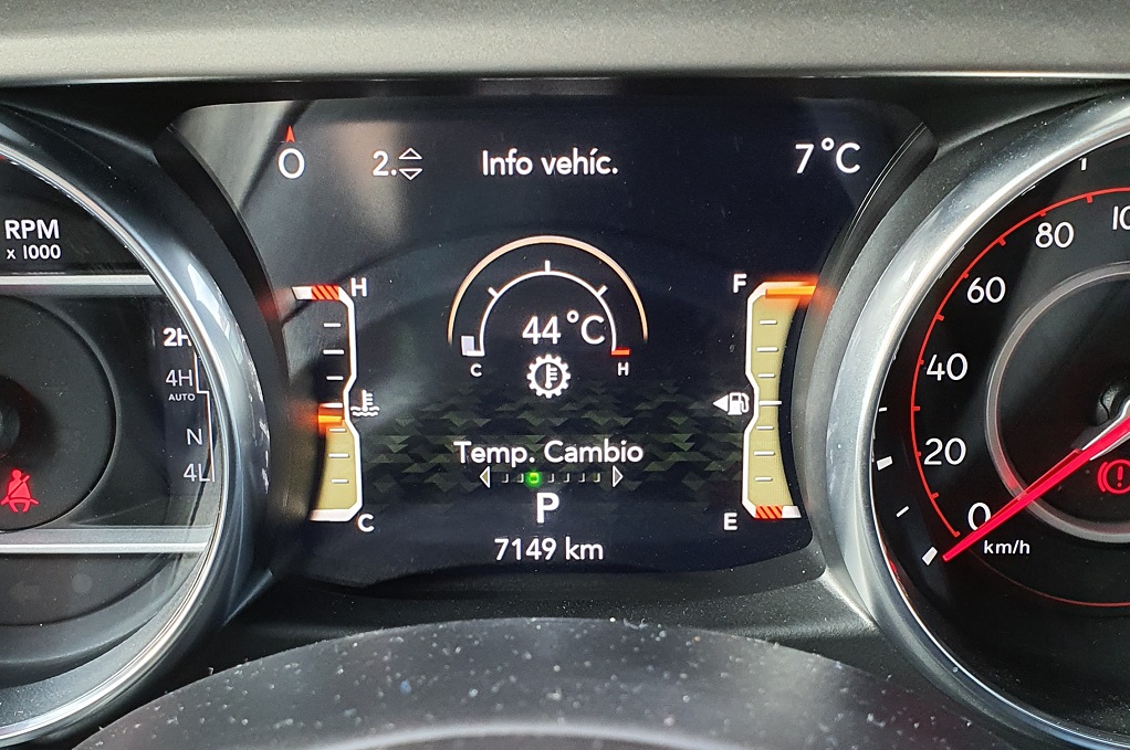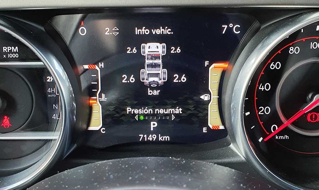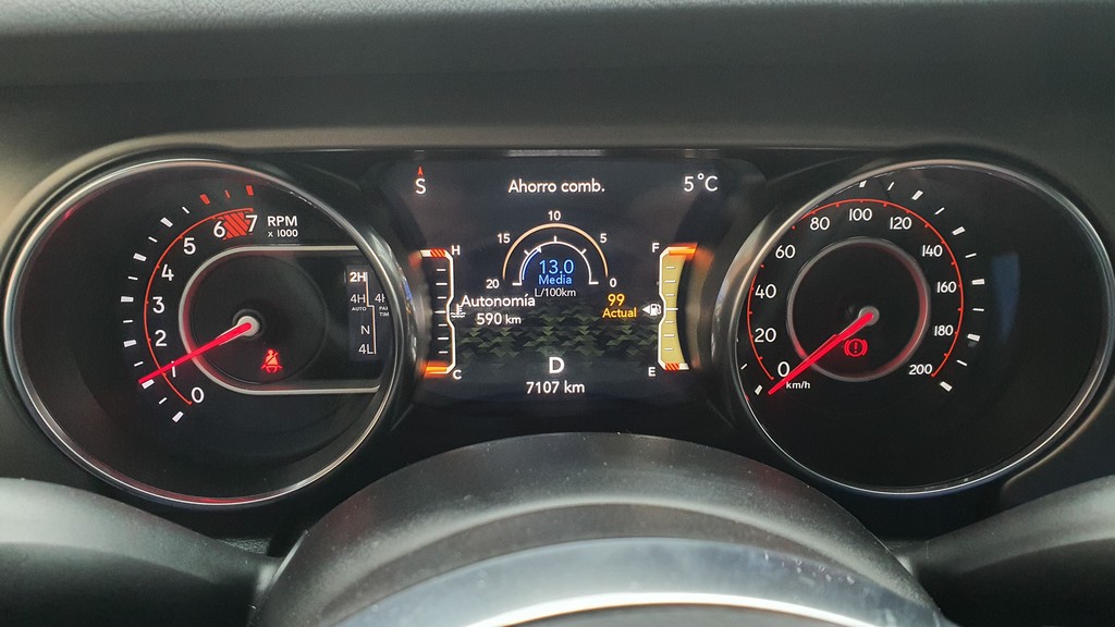 También en lo que respecta a los sistemas de ayuda a la conducción el Wrangler conjuga esa combinación de coche premium y todoterreno sin compromisos. Podemos encontrar desde un buen sistema de cámaras y sensores de aparcamiento (indispensable por el volumen del coche), estado de la batería o indicadores de presión de neumáticos hasta todo tipo de información para su uso todoterreno como ángulos de inclinación, estado del sistema de tracción o temperatura del motor pero también del cambio (muy importante cuando hacemos uso de la reductora).