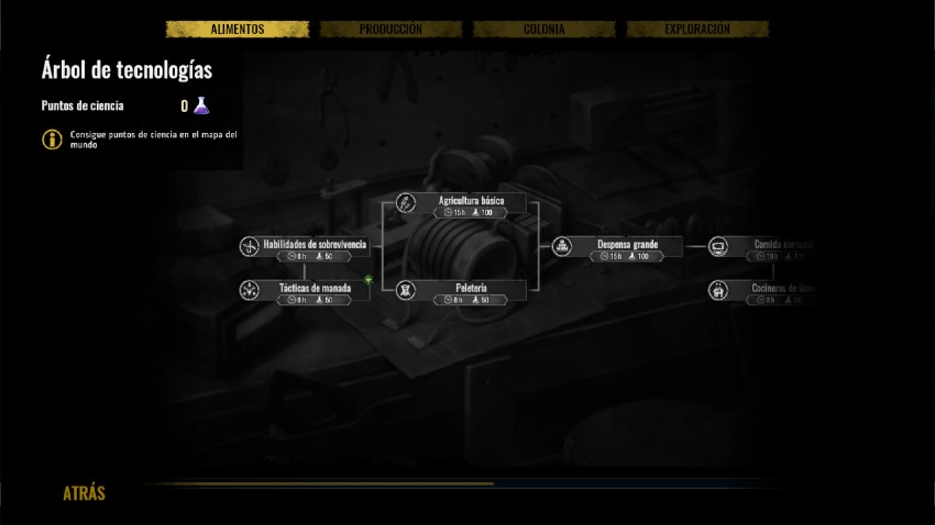 Con la ciencia se consiguen nuevas infraestructuras y habilidades. Este sistema de ciencia recuerda al de Civilization y también y es el mismo del Surviving Mars. La diferencia es que aquí, para investigar nuevas acciones necesitaremos recolectar ciencia y la ciencia se consigue en el mapa de exploración con los exploradores. Estos tendrán que ir descubriendo el mapa que rodea a nuestra colonia y en algunos lugares encontrarán ciencia.