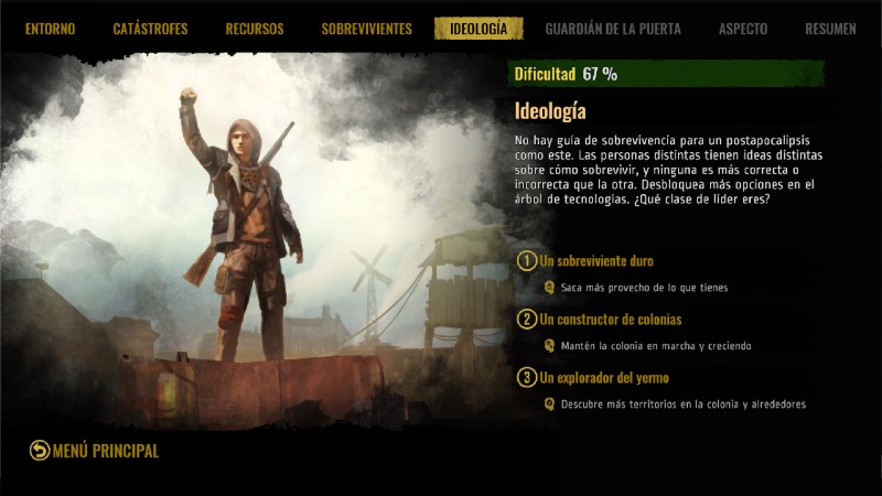 Nosotros seremos los líderes de la colonia, elegiremos que se construye y donde, para ello primero tenemos que elegir la ideología con la que trabajaremos. Podemos ser un sobreviviente duro que sacará más provecho a los recursos; un constructor de colonias, que mantendrá la colonia siempre en marcha y creciendo; o un explorador del yermo que dispuesto a descubrir territorios.