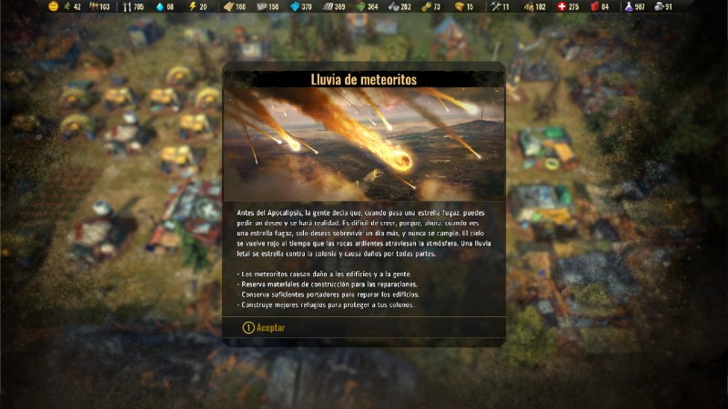Las catástrofes nos pueden atacar en cualquier momento, aunque el juego nos avisará en cuanto tiempo nos sobrevendrá, para que podamos prepararnos. Hay distintos tipos de eventos que nos pueden ocurrir, lluvia de meteoritos, tormentas eléctricas o pandemias (muy adecuada en estos tiempos).