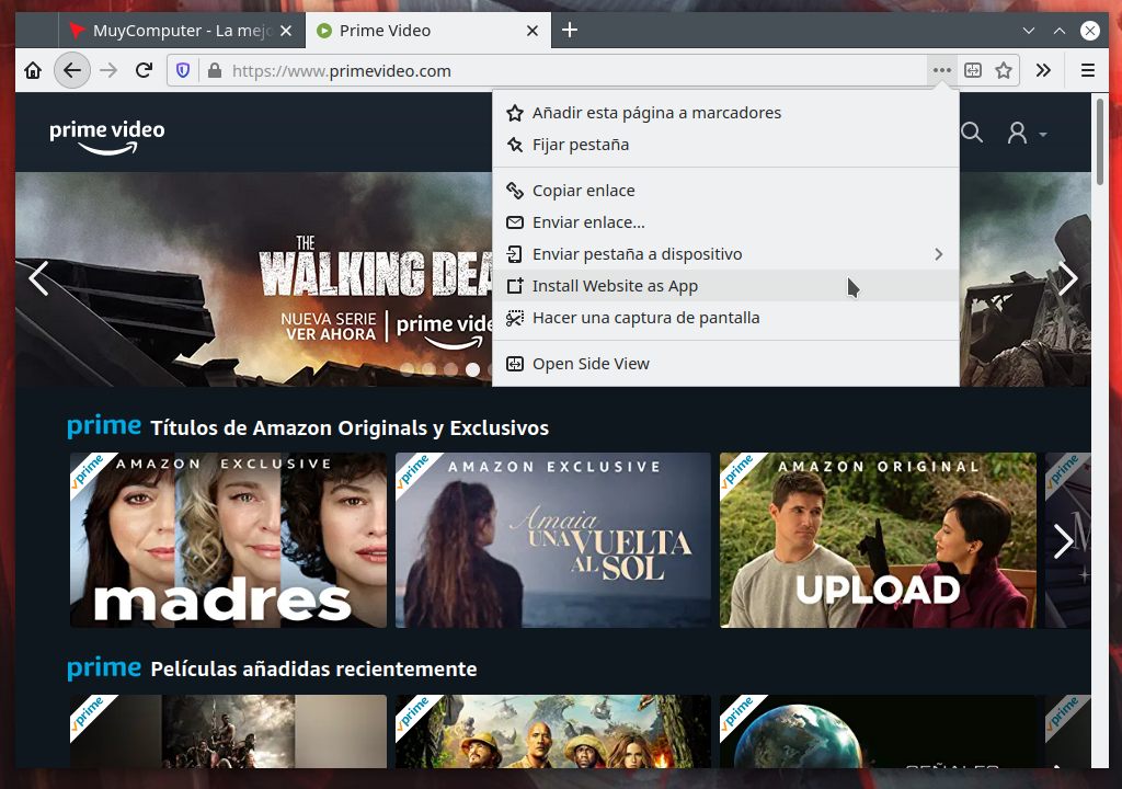 Ahora ya puedes dirigirte a cualquier sitio web que te gustaría tener como aplicación y a través del menú «Acciones con la página» crear una webapp con la opción «Install Website as App«.