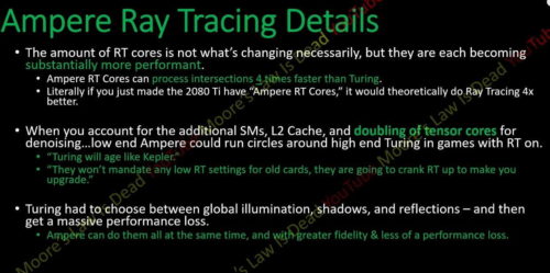 Puede parecer exagerado, pero si Ampere realmente multiplica por cuatro el rendimiento de Turing en trazado de rayos sería perfectamente viable. Sobre esta cuestión es importante recordar que NVIDIA doblará, en teoría, la relación de núcleos tensor por cada unidad SM, lo que en el caso de la RTX 3080 Ti nos dejaría un total de 168 núcleos RT. Para que os hagáis una idea de lo que esto supone os recuerdo que la RTX 2080 Ti tiene 68 núcleos RT.