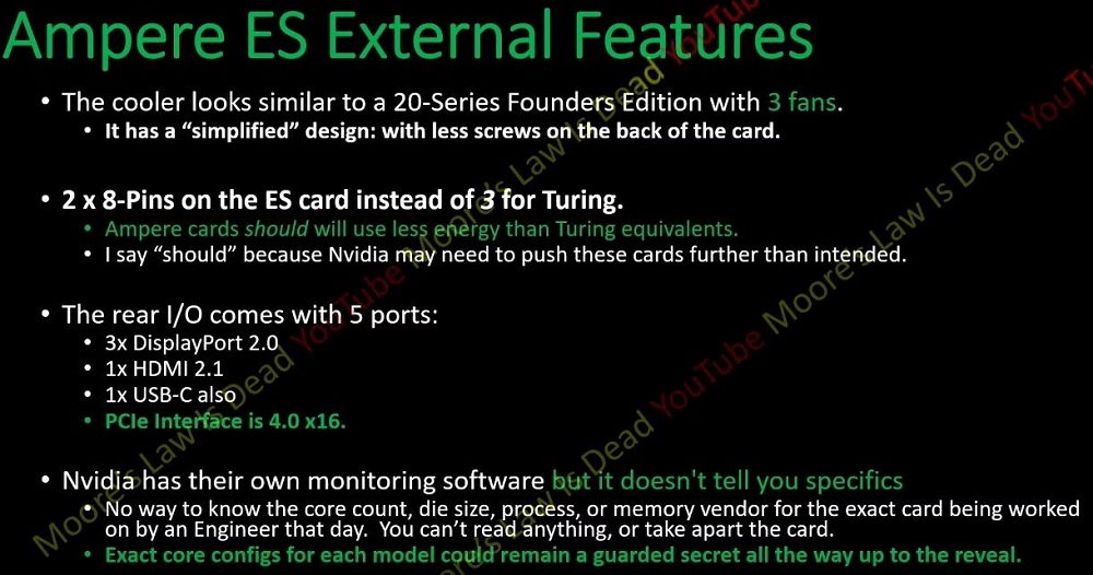 La RTX 3080 Ti contará con un nuevo sistema de refrigeración basado en tres ventiladores y tendrá una construcción simplificada que buscará reducir costes sin que la calidad se vea afectada. Como estaba previsto vendrá fabricada en proceso de 7 nm, aunque se comenta que los modelos de gama media de la serie Ampere utilizarán el proceso de fabricación de 8 nm.