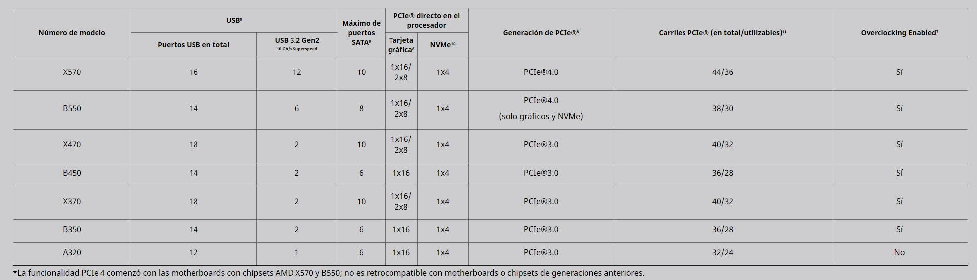 - Nivel alto: en esta posición se encuadran los chipsets X370, X470 y X570. Soportan overclock y configuraciones multiGPU. Encontramos diferencias más importantes que ya no se limitan al soporte de Precision Boost Overdrive y Store MI, presentes en las placas X470 y X570, sino que también se extienden al soporte del estándar PCIE Gen4, presente únicamente en las placas base X570, ya que fue deshabilitado en los modelos X470 compatibles.
