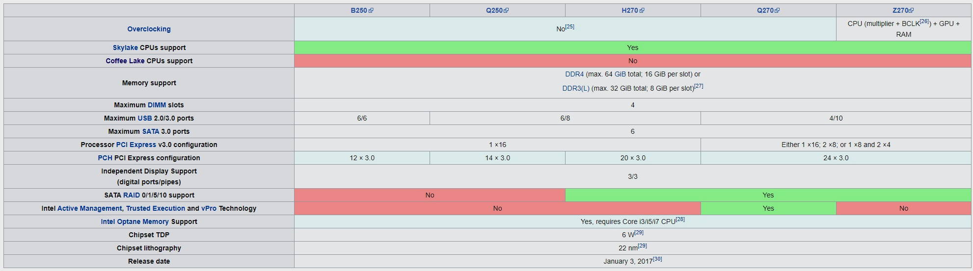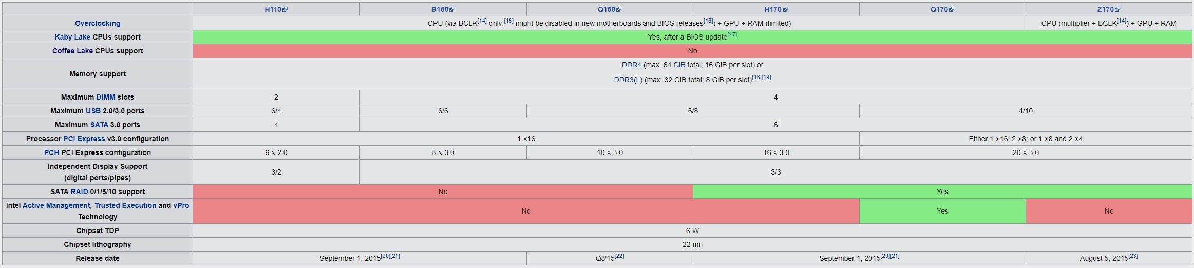 Aunque algunas generaciones de procesadores asociados a determinados chipsets ya han sido descatalogados todavía podemos encontrar una gran variedad de placas base que utilizan versiones que podemos considerar como «antiguas». Por ejemplo, los procesadores basados en la arquitectura Skylake (Core 6000) necesitan una placa base con chipset serie 100 o serie 200, y lo mismo ocurre con los procesadores Kaby Lake (Core 7000). Podéis ampliar los cuadros haciendo clic en ellos.
