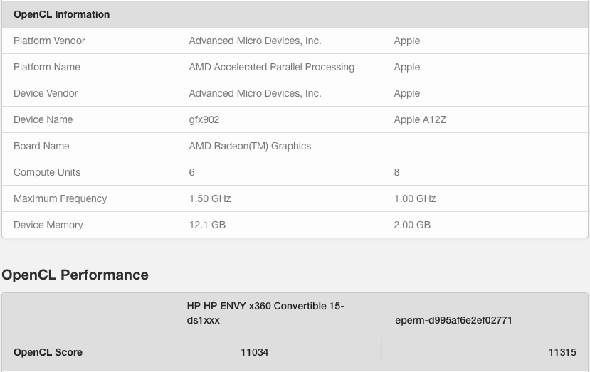 Hace poco vimos que el SoC Apple A12Z es tan potente que puede superar al chip Snapdragon semipersonalizado que está presente en la Surface Pro X, y eso que el primero pierde rendimiento al funcionar bajo la capa de emulación Rosetta 2 y tenía, además, desactivados los cuatro núcleos de alta eficiencia, y hoy hemos podido ver los primeros datos de rendimiento de la GPU de dicho chip bajo OpenCL, una prueba en la que se ha recurrido también a Rosetta 2.