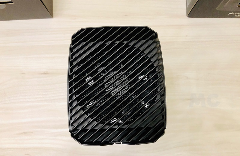 En este sentido, también hay otra cosa que debemos tener muy en cuenta, y es que la colocación del procesador y de la tarjeta gráfica en los laterales permite que sean los primeros componentes en recibir el «impacto» del aire fresco que entra del exterior. Como podemos ver en la imagen adjunta, el aire entra por los agujeros que tiene el chasis del Corsair One a100 en los laterales, y en la parte superior se encuentra ubicado un ventilador Corsair ML (levitación magnética) de 140 mm que se ocupa de extraer el aire caliente.