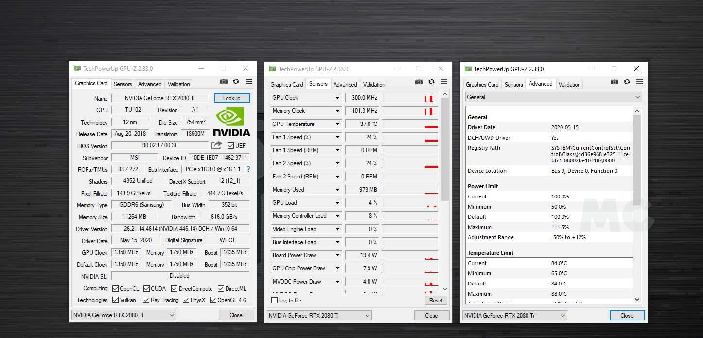 En la captura de pantalla podemos ver las especificaciones completas de la RTX 2080 Ti que monta el Corsair One a100. Su temperatura en reposo es realmente buena, ya que se mantiene por debajo de los 40 grados, y cuando la sometemos a una carga de trabajo intensivo y sostenido los valores no se disparan.
