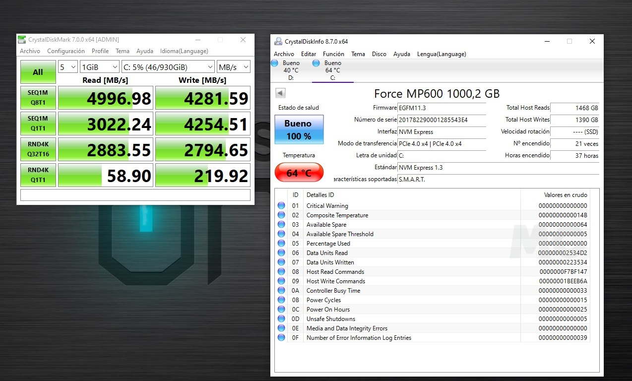 - Almacenamiento principal: SSD NVME PCIE Gen4 Corsair MP600 de 1 TB.