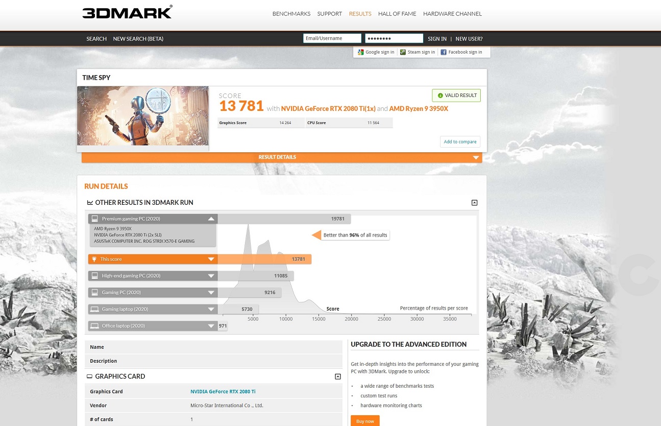 El Corsair One a100 supera sin problemas esta prueba y logra un resultado que a priori parece muy elevado, ¿pero qué quieren decir esos 13.781 puntos? Pues muy sencillo, fijaros en la imagen inferior, el Corsair One a100 rinde más que el 96% de todos los equipos presentes en la base de datos de 3DMark, supera de largo a un PC de gama alta para gaming de 2020 y solo pierde ante un sistema configurado con dos RTX 2080 Ti, casi nada para un pequeñín de 12 litros, ¿verdad?