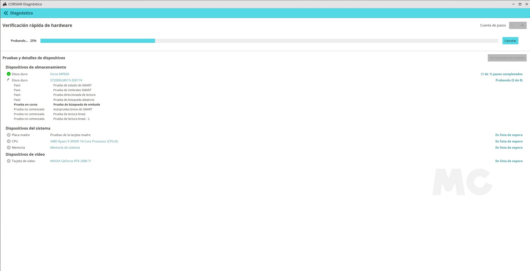 Una vez que conectamos todos los cables estamos listos para encender el Corsair One a100. Nada más hacerlo iniciamos el proceso de configuración de Windows 10 y listo, estamos listos para empezar a disfrutarlo. Contamos con la herramienta de diagnóstico de Corsair, muy útil para comprobar el estado del sistema, y también tenemos el software iCUE, que nos permitirá controlar la iluminación del Corsair One a100 y de todos los periféricos que utilicemos.