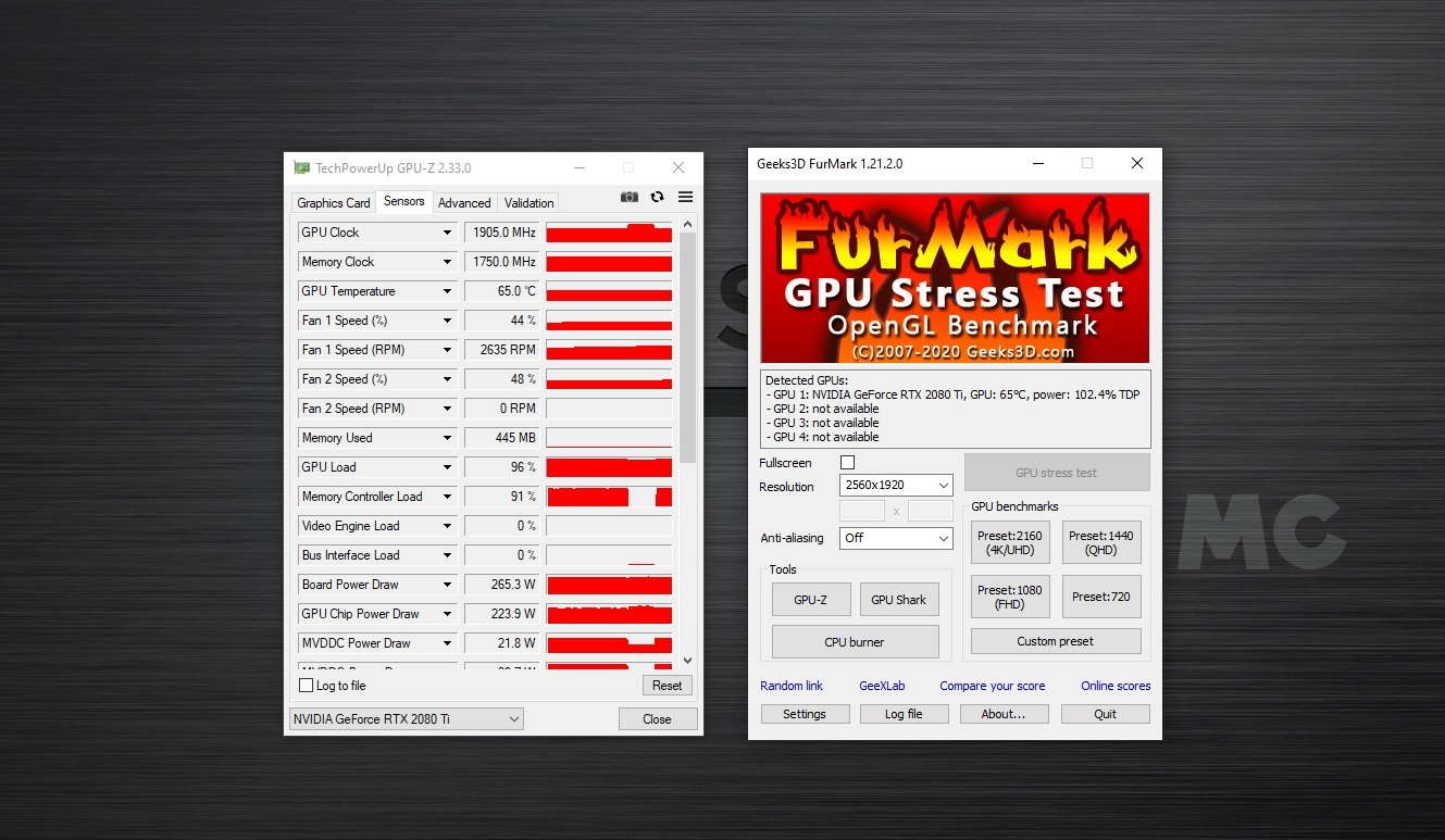 Trabajando a plena carga de forma sostenida durante 30 minutos con FurMark la temperatura de la GPU se estabiliza en los 65 grados, un resultado excelente que confirma el buen trabajo que ha hecho Corsair con el sistema de refrigeración que monta la RTX 2080 Ti instalada en el Corsair One a100.