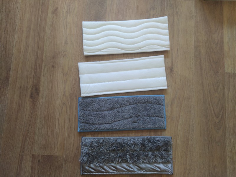 Como hemos comentado antes este robot tiene dos modos de limpieza, el fregado y limpieza de polvo o mopa. Para elegir entre uno u otro simplemente tenemos que poner el paño que corresponda. El Braava jet m6 incluye dos paños de limpieza reutilizables, uno para limpieza en seco y otro para fregado. Y tres desechables, dos de fregado y uno de limpieza de polvo. Sabremos a que tipo de limpieza corresponde cada uno por el color de la etiqueta de acoplamiento que incorporan en su parte posterior. Azul es para limpieza en mojado, blanco para la limpieza en seco. En el empaquetado cada paño viene con una etiqueta de cartón que indica el tipo de paño que es en varios idiomas y con una gota tachada o no según el tipo que sea.
